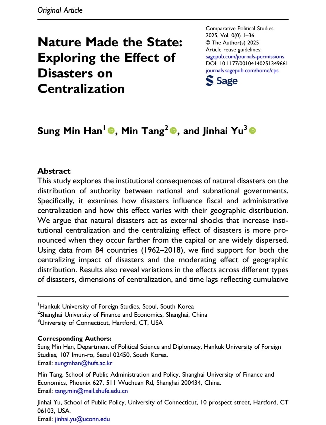 近日,我院行政管理系唐敏老师与合作者的研究成果("Nature Made the State: Exploring the Effect of Disasters on Centralization")发表于政治学顶级期刊《Comparative Political Studies》。该期刊是比较政治学的旗舰期刊,在我校期刊分级目录中列为国际期刊Tier 1。