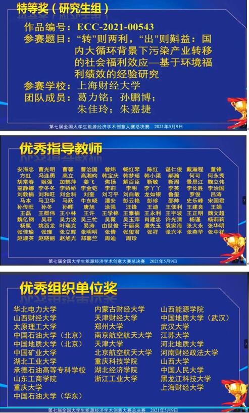 据悉,本届大赛收到了全国139所高校的1013支队伍报名参赛。按照大赛的规则,773份有效作品进入评审环节。大赛分为初赛和决赛两个环节,40余位能源经济领域专家参与了通讯评审,10位专家参加了会评,共选出18支研究生队伍、15支本科生队伍入围决赛,并有87支参赛队伍获得二等奖,163支队伍获得三等奖。入围决赛的选手通过网络问辩角逐特等奖、一等奖及单项奖。经过播放答辩视频和线上问答,评审委员会打分确定了本科生组和研究生组的获奖名单,其中研究生组共产生特等奖3名、一等奖15名。我院/所师生蝉联三届该项赛事的特等奖和优秀指导教师奖,彰显了我院/所相关学科的研究生培养成效。